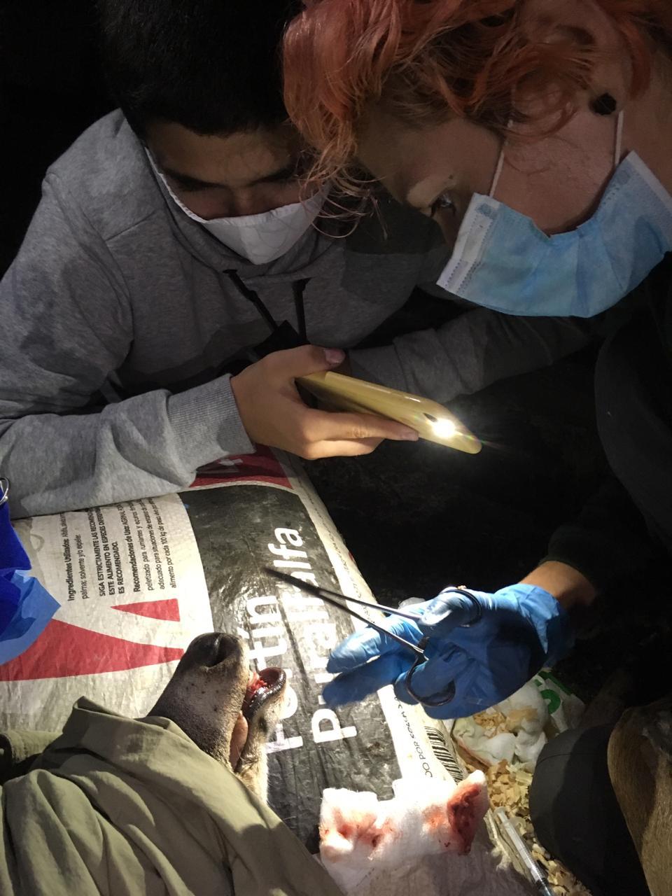Los trabajadores lo encontraron herido en uno de sus potreros, atacado por los perros del lugar y lo llevaron a un establo hasta donde llegó el equipo de fauna silvestre de Cornare con todos los elementos para la atención del animal en el sitio.